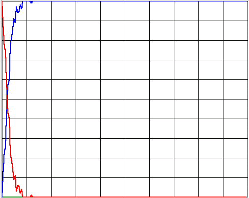 Obiges Schema wurde alsDelphi-Programm realisiert. Das folgende Schaubild zeigt den Verlauf der Simulation. Für jeden Prozentsatz an Startmuster-Neuronen wurden 100 Simulationsschritte durchgeführt. Manchmal setzt sich das Startmuster durch, manchmal gewinnt die Drift gegen irgendwelche Zufallsmuster. Die blaue Kurve zeigt, wie oft sich das Startmuster durchsetzt, die rote Kurve, wie oft die Drift Oberhand gewinnt. Es ist deutlich zu sehen, daß die Fehlerquote ab ca. 10% belegter Neuronenzahl gegen 0 geht.